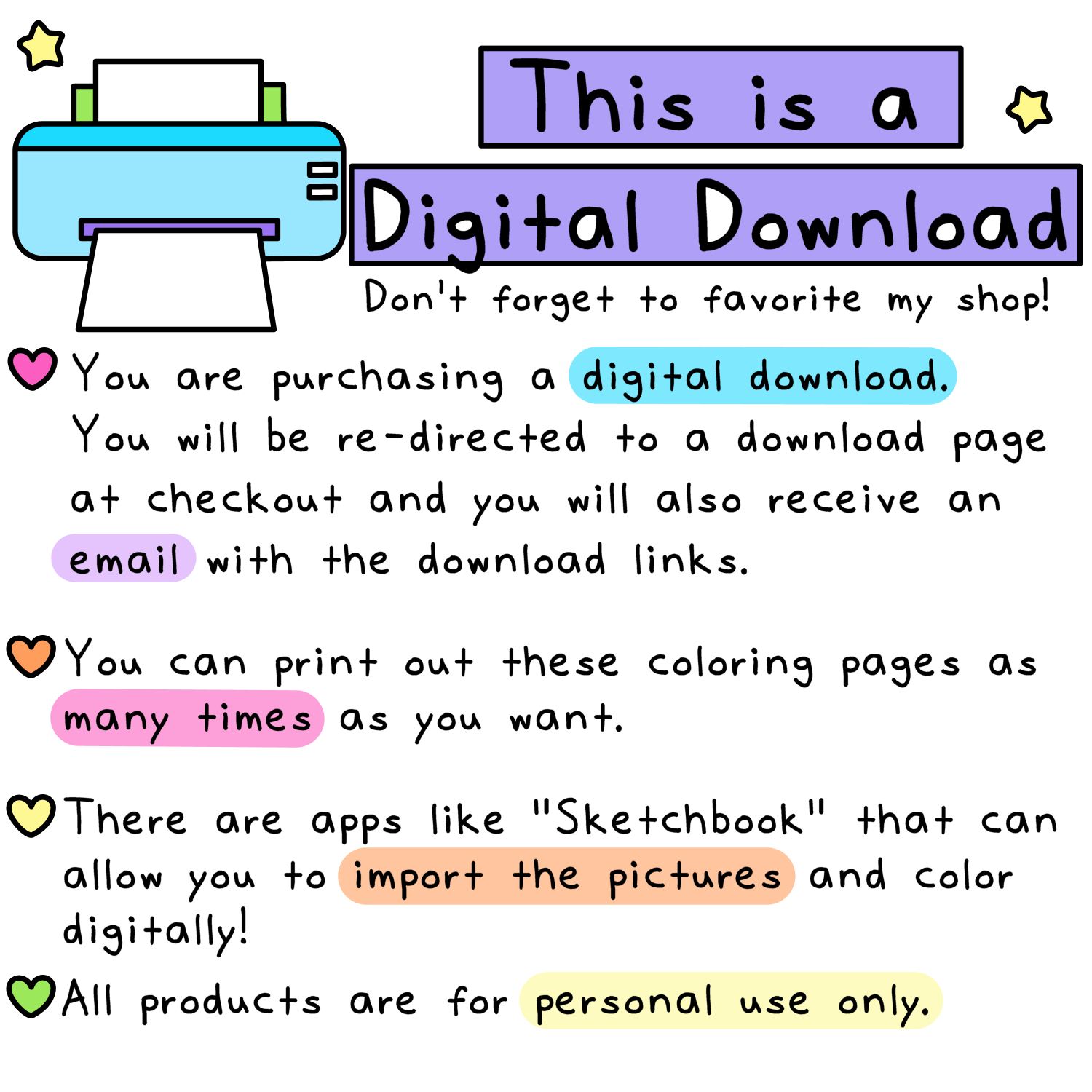 Multiple Formats: Your coloring pages are available in PDF, PNG, and JPG formats, ensuring you have the flexibility to choose your preferred medium. Print them out on your favorite paper and enjoy traditional coloring, or explore digital coloring using apps like Sketchbook. The choice is yours!
