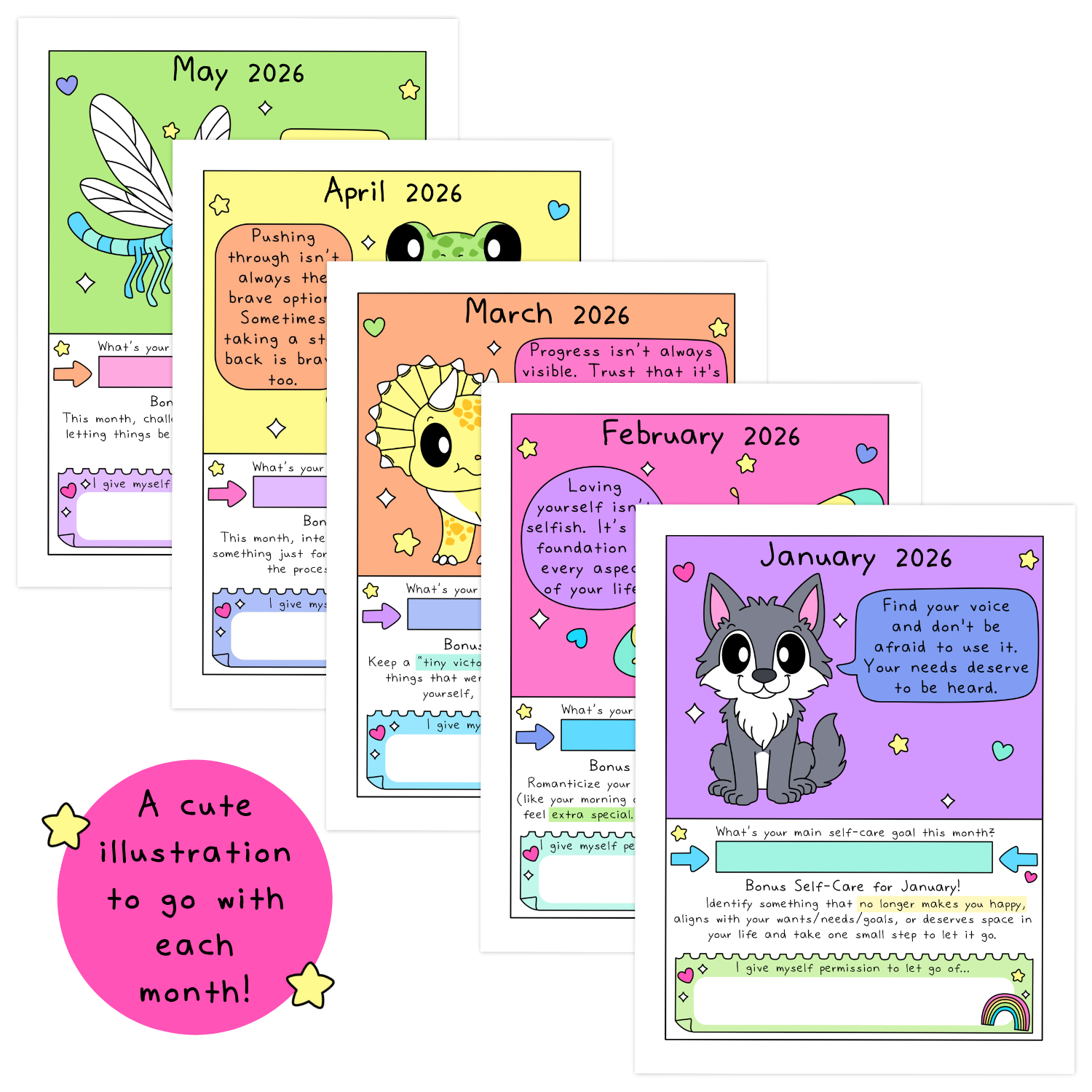 Cute Monthly Animal: Each month brings a new cute doodle and encouraging message to cheer you on.