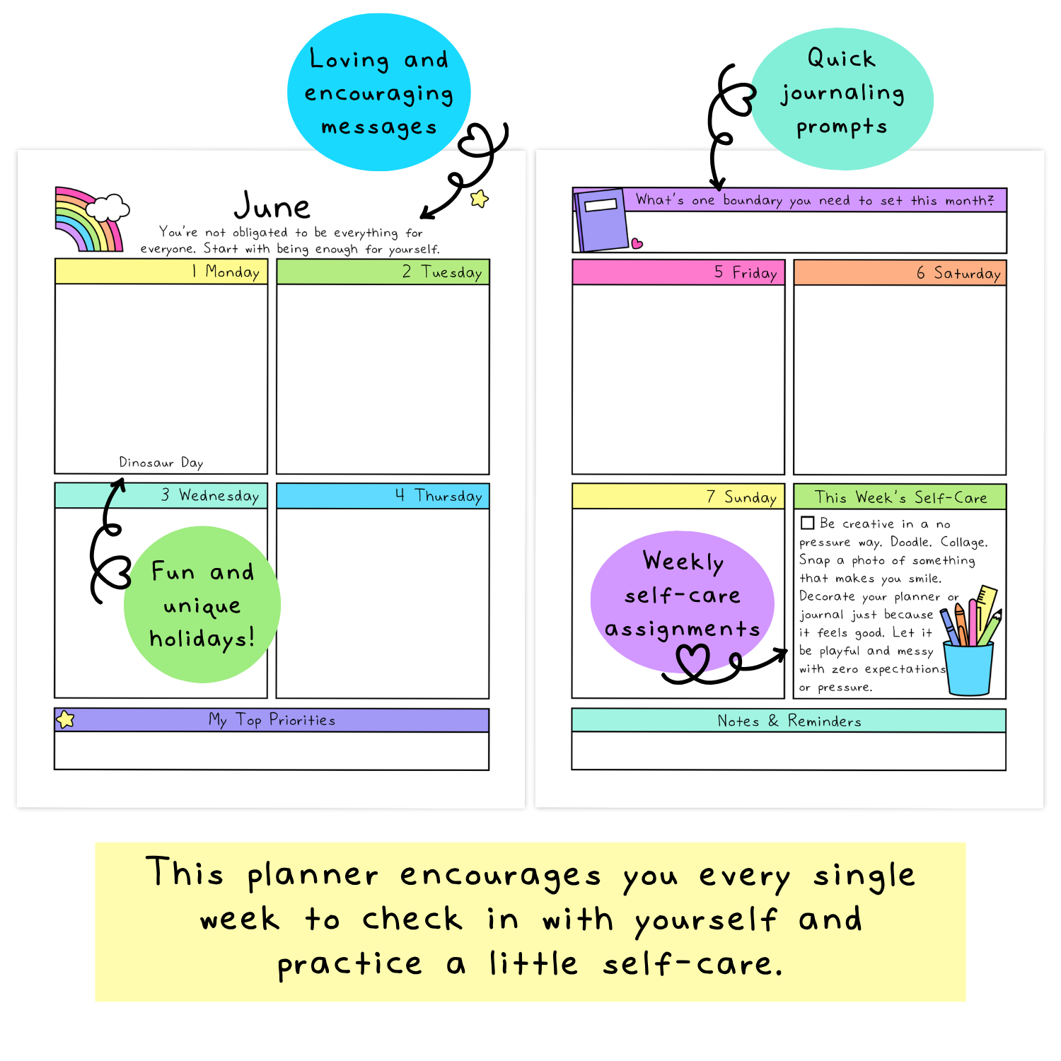 - Gentle Encouragement: This planner is supposed to be (above all else) a fun tool that helps you put self-care to the forefront of your mind.