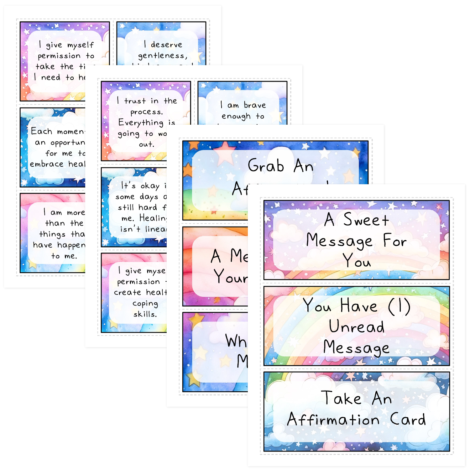 Each version comes with two label pages, featuring a total of 6 labels, and six card pages, with six cards on each page (for a total of 30 affirmations!).