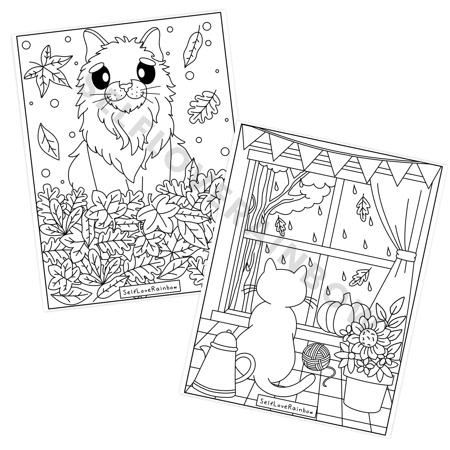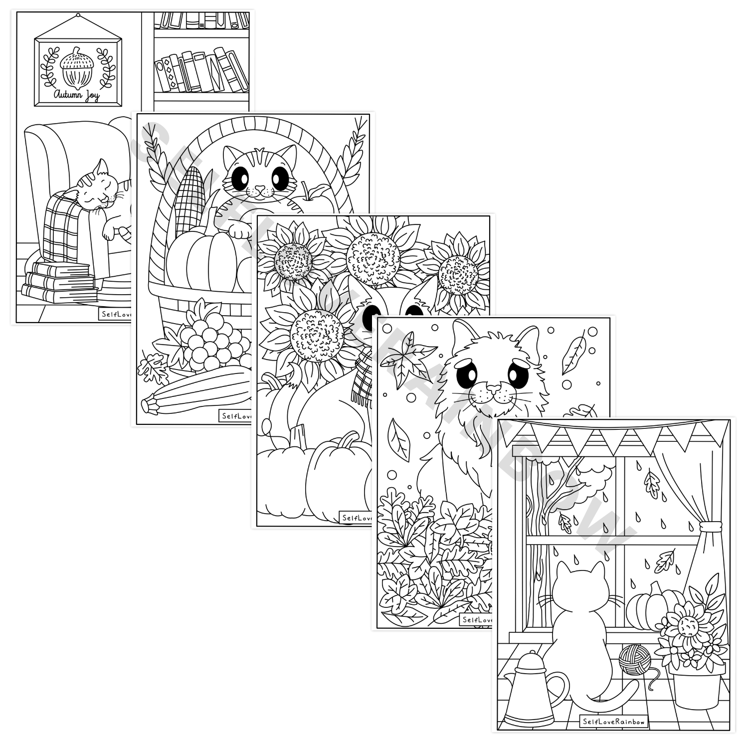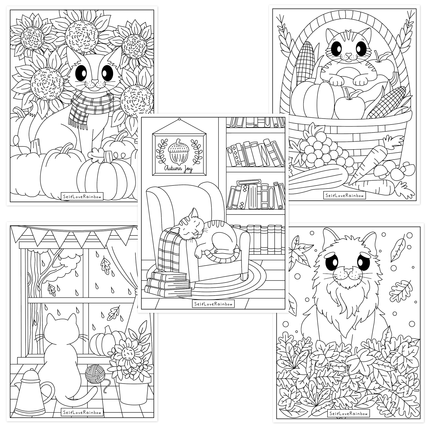 A set of 5 unique, hand-drawn coloring pages featuring coziness and a furball: