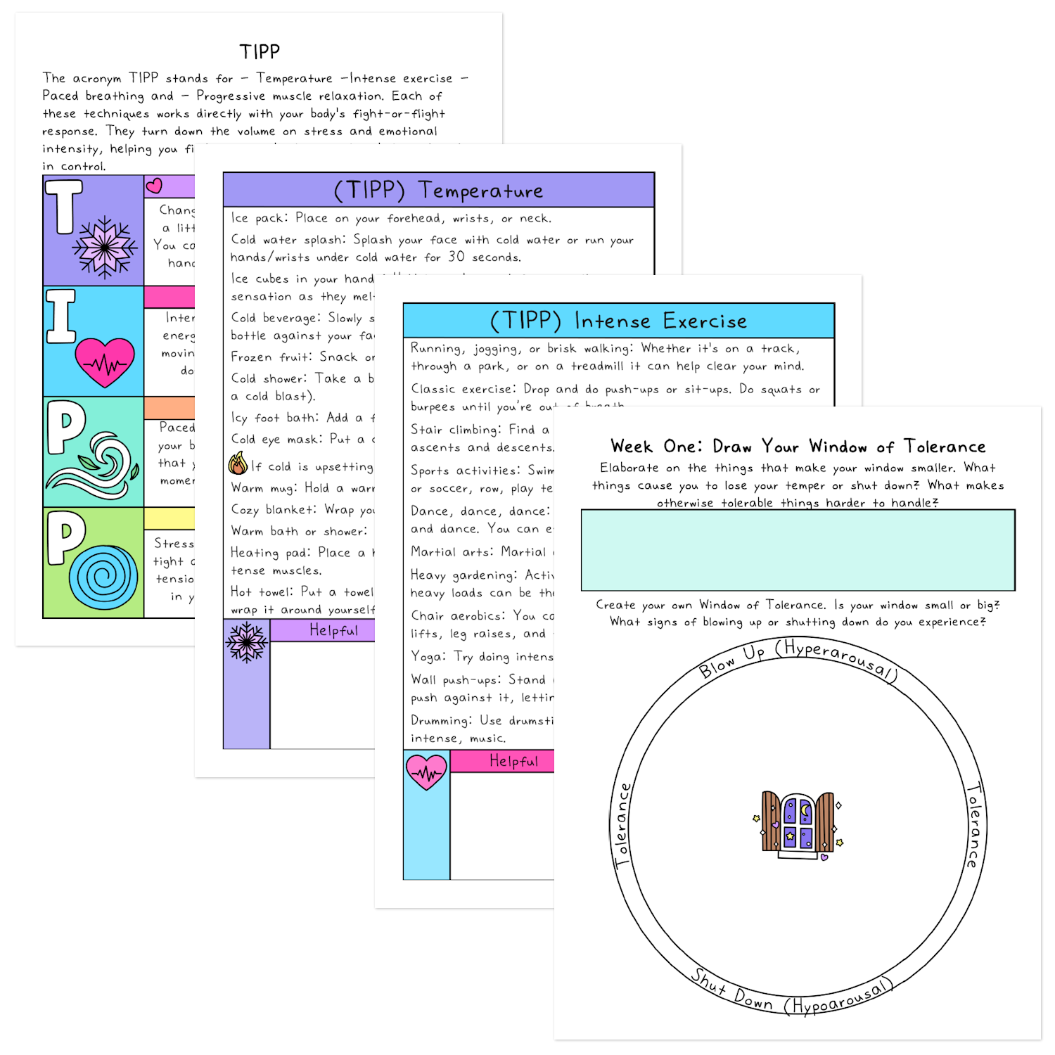 This 26-page printable workbook (which comes with a full-color version and an additional black-and-white version) will help you understand and manage your emotions when you feel like you're about to blow up or shut down. You'll learn about the window of tolerance, how to recognize when you're outside of it, and what to do to get back in.