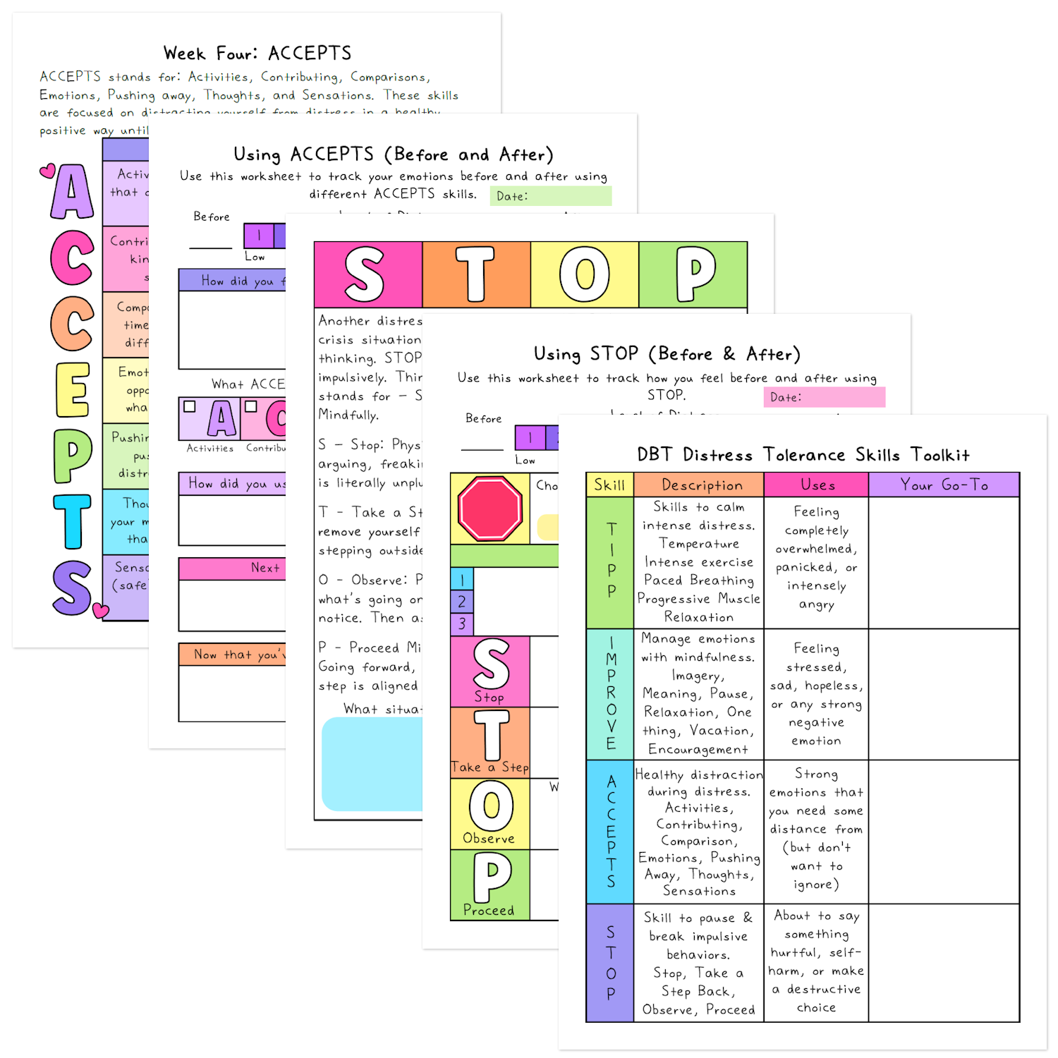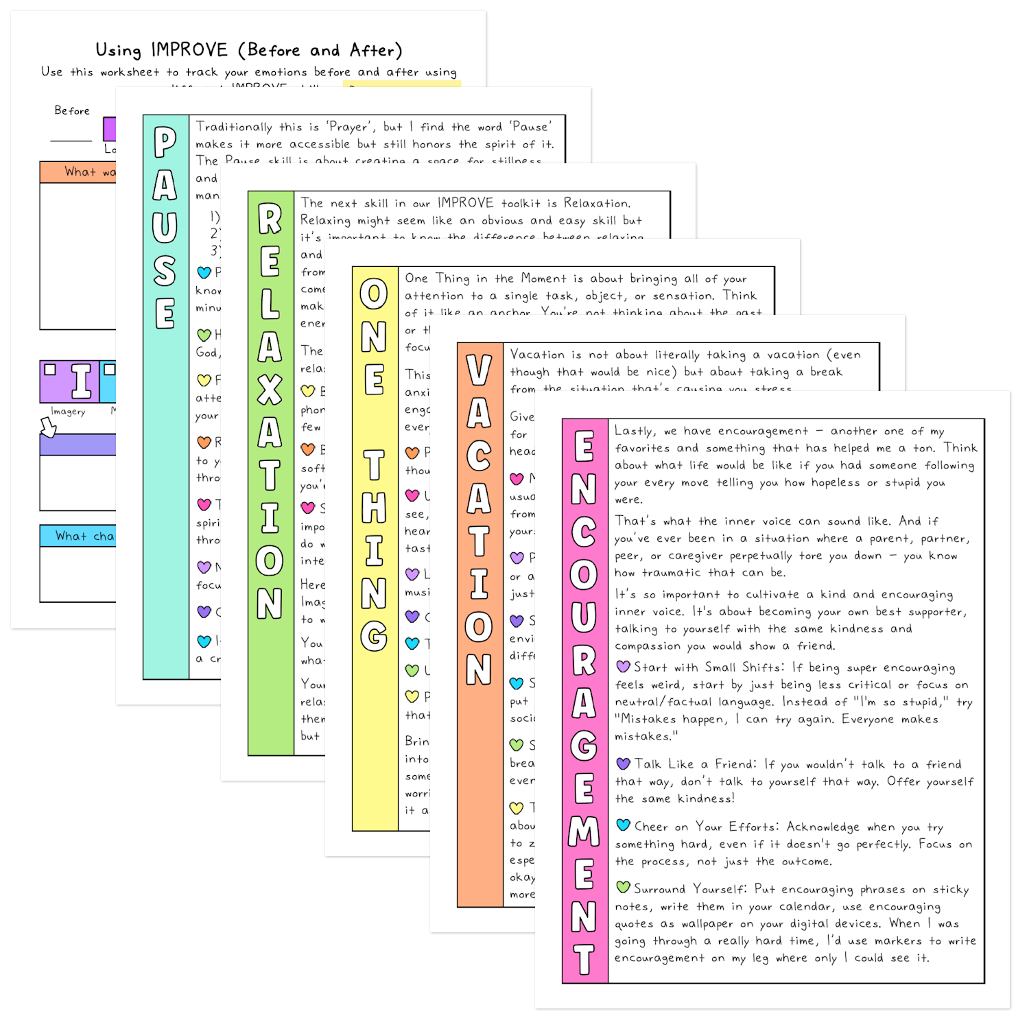 Because this worksheet is created using a foundation of DBT (dialectical behavior therapy) but through the lens of my own experiences, you might find a few aspects that are outside of traditional DBT like using "Pause" instead of "Pray" in the IMPROVE skill.