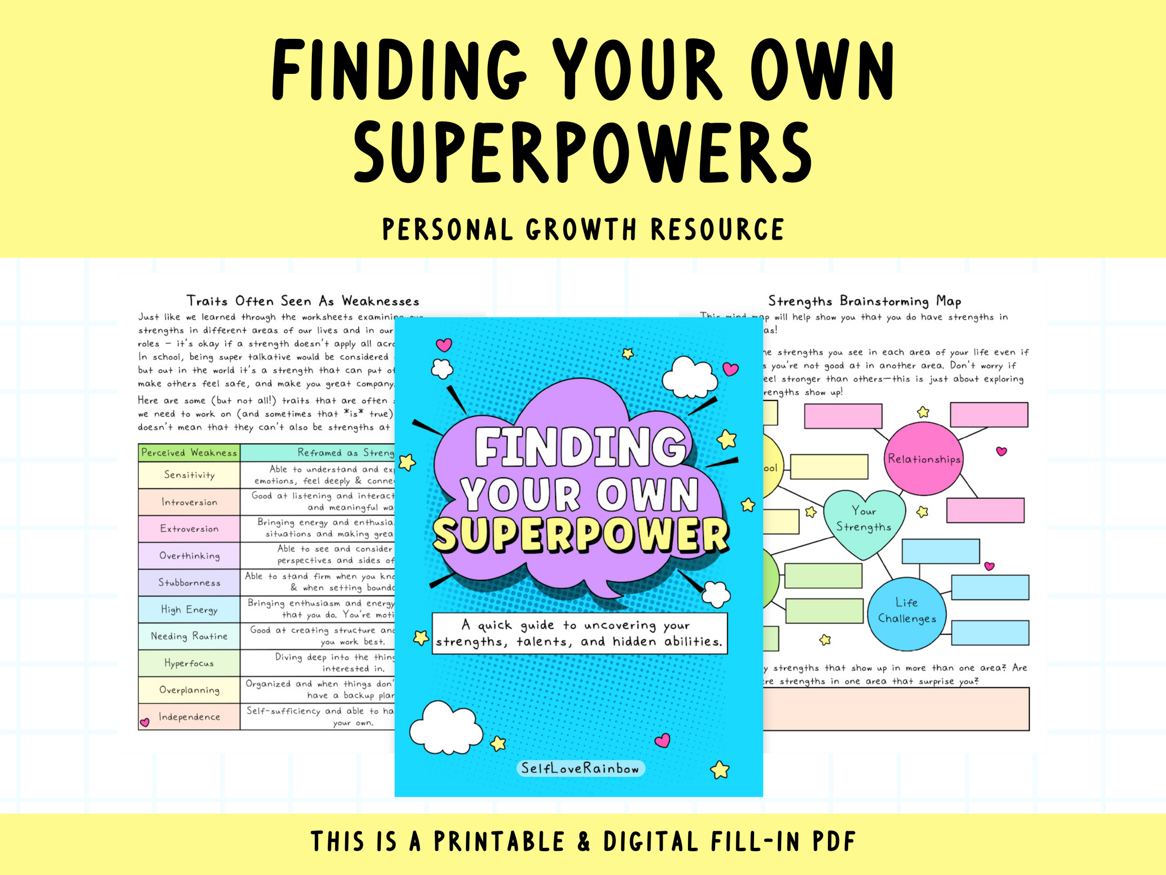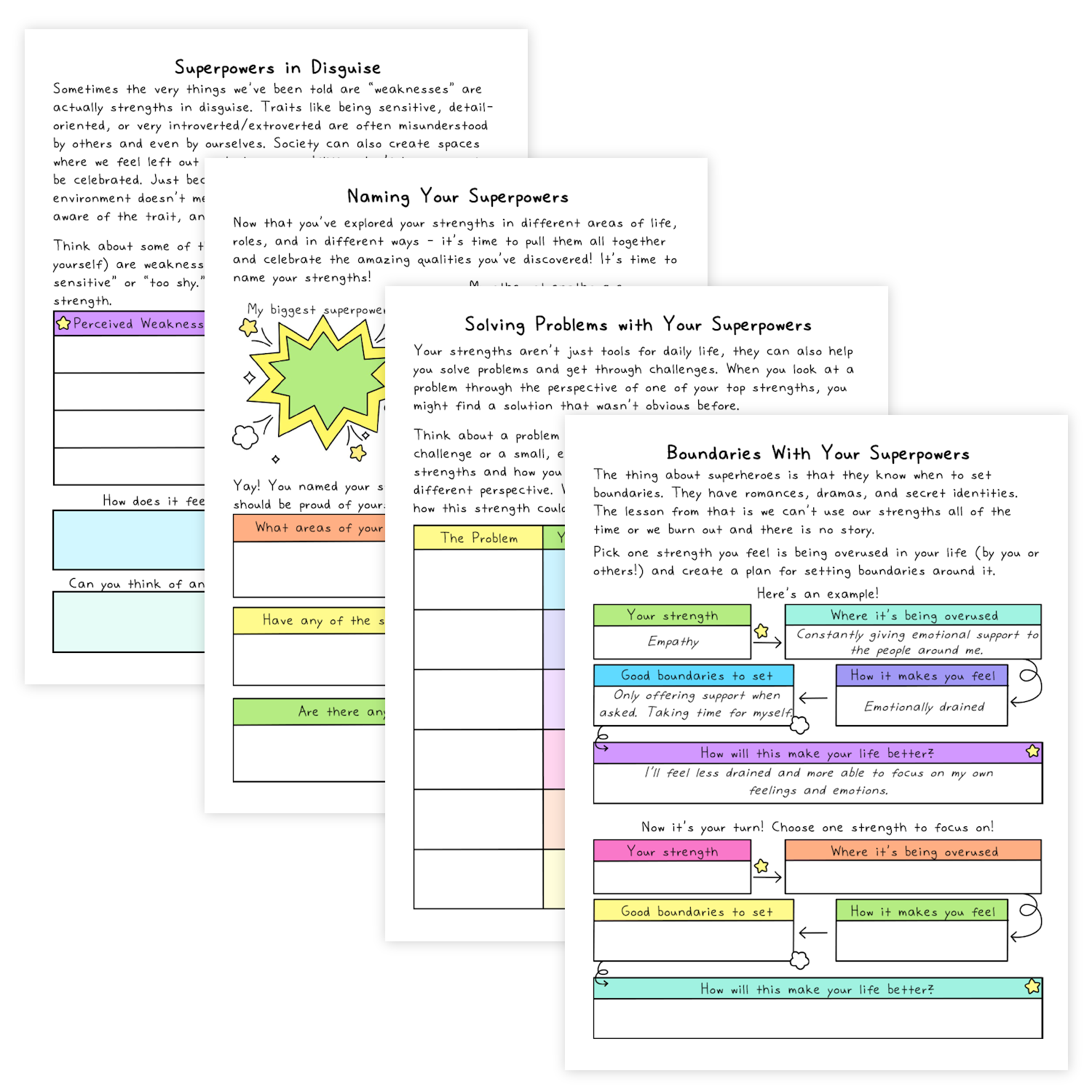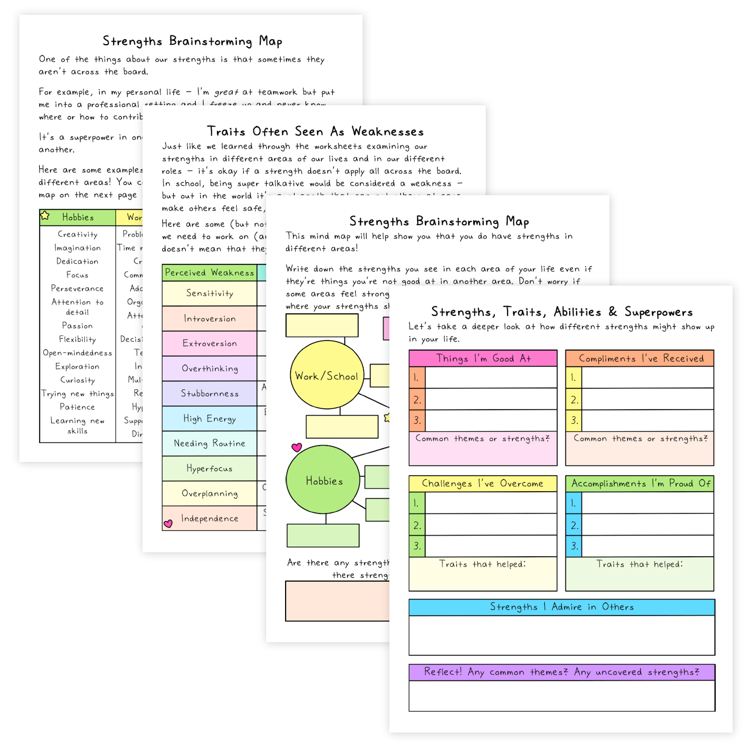 Another worksheet focuses on traits that are often seen as weaknesses and how those can be strengths even if, in some areas of life, they don't fit the "norm" or aren't productive.