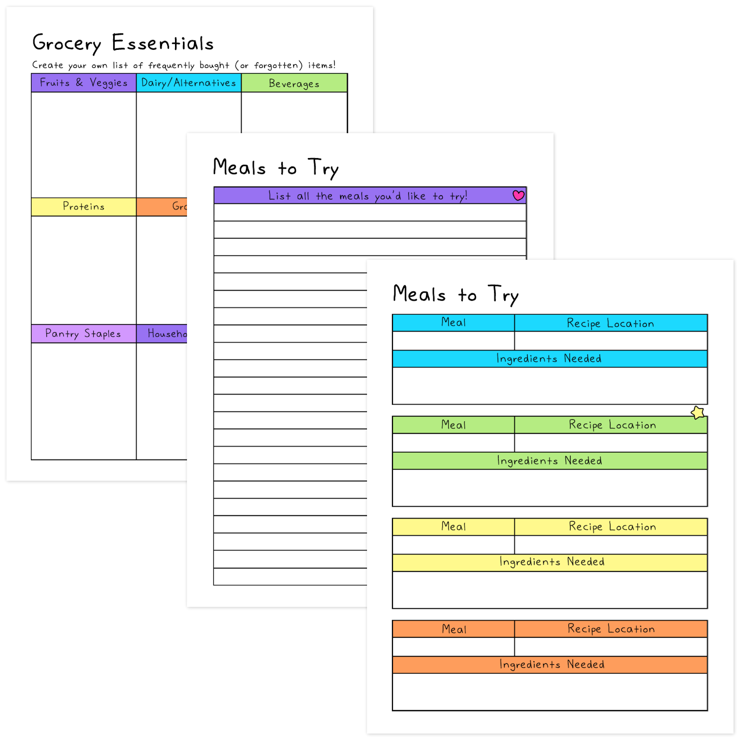 - Grocery Essentials (One pre-made list and one blank list. Scan it while you're making your grocery list to make sure you don't forget anything)