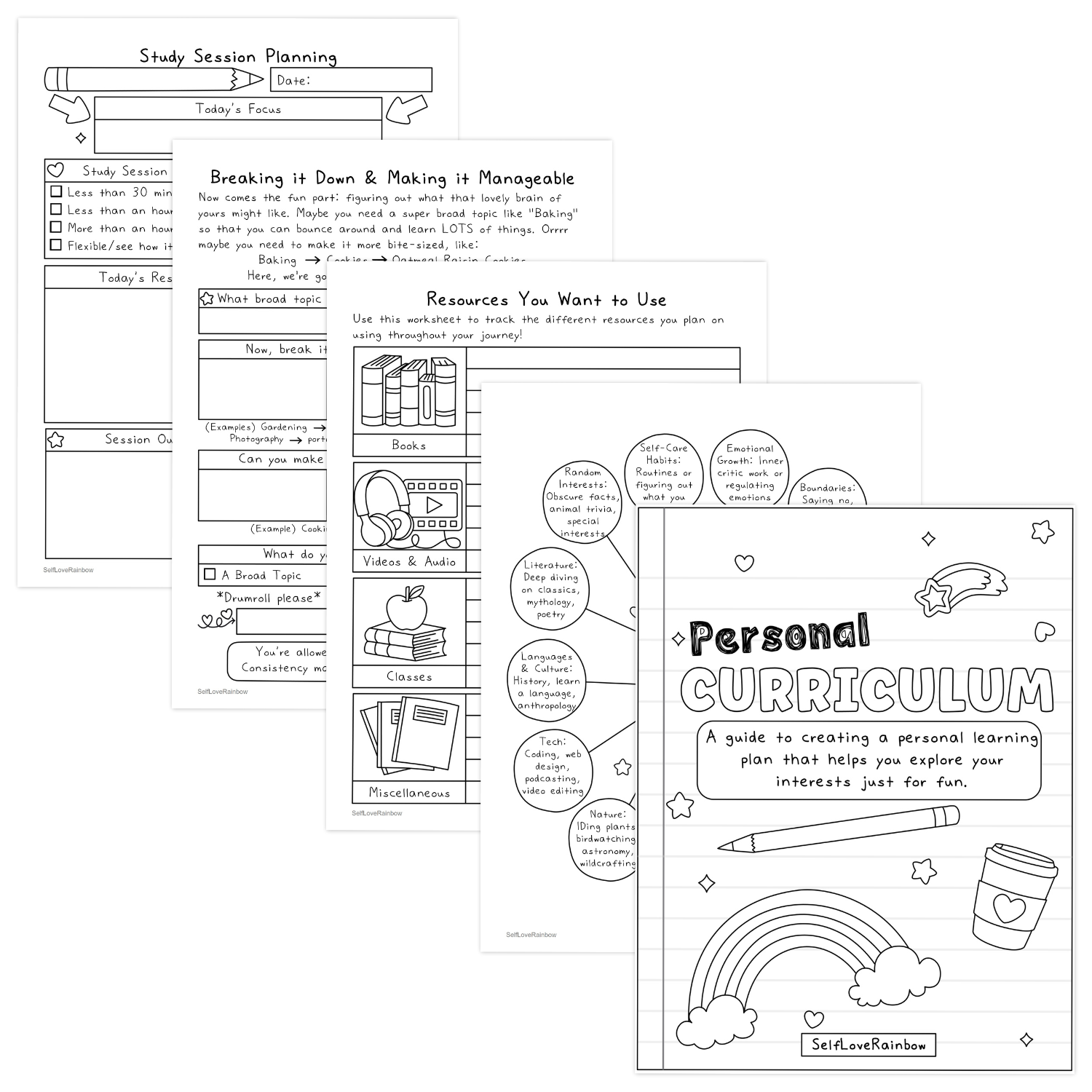 - Resource Tracking: Easy worksheets to keep track of the books, podcasts, and videos you want to use.