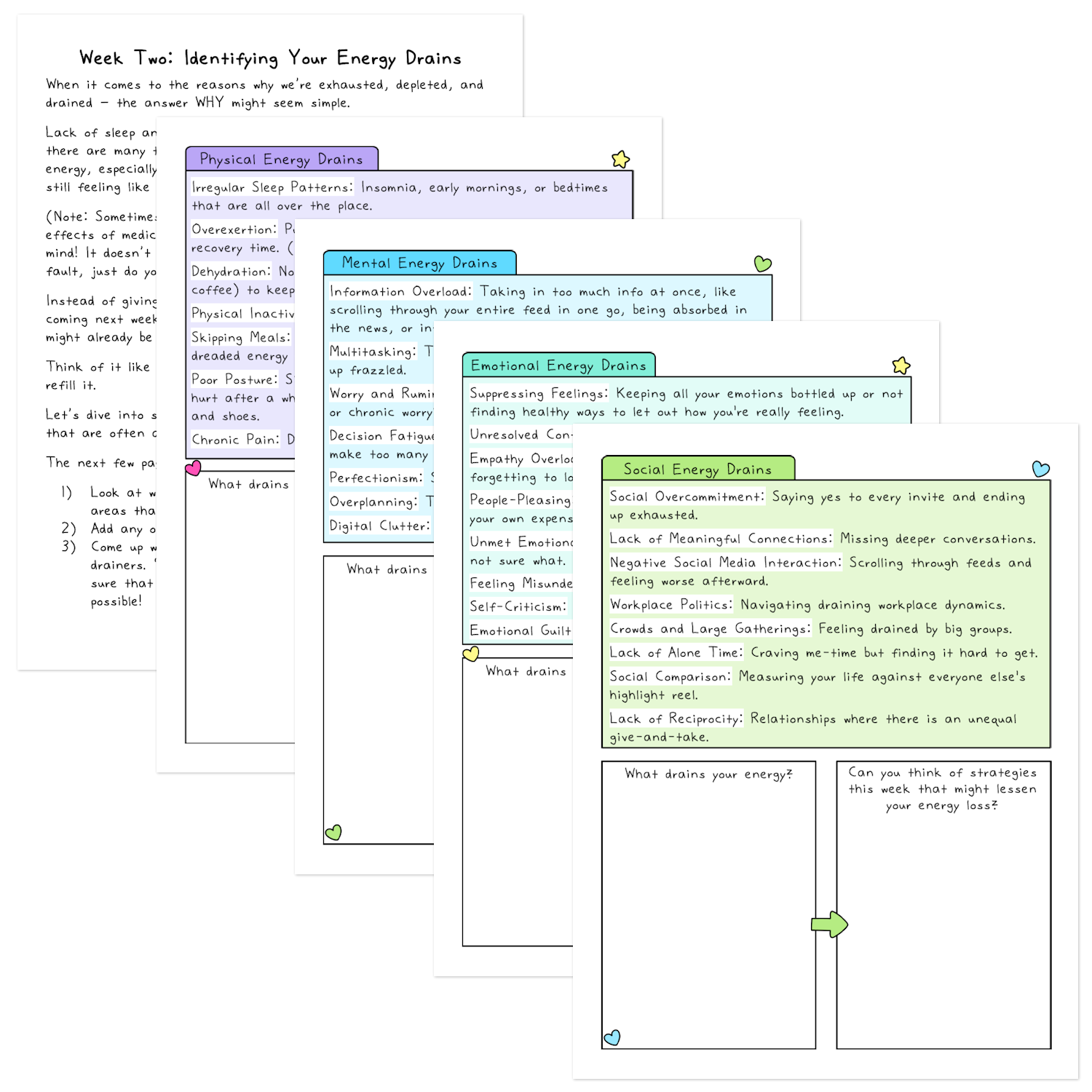 - Worksheets to help you identify your personal energy drains – we're talking about plugging those "holes in the bucket" before you try to refill it!