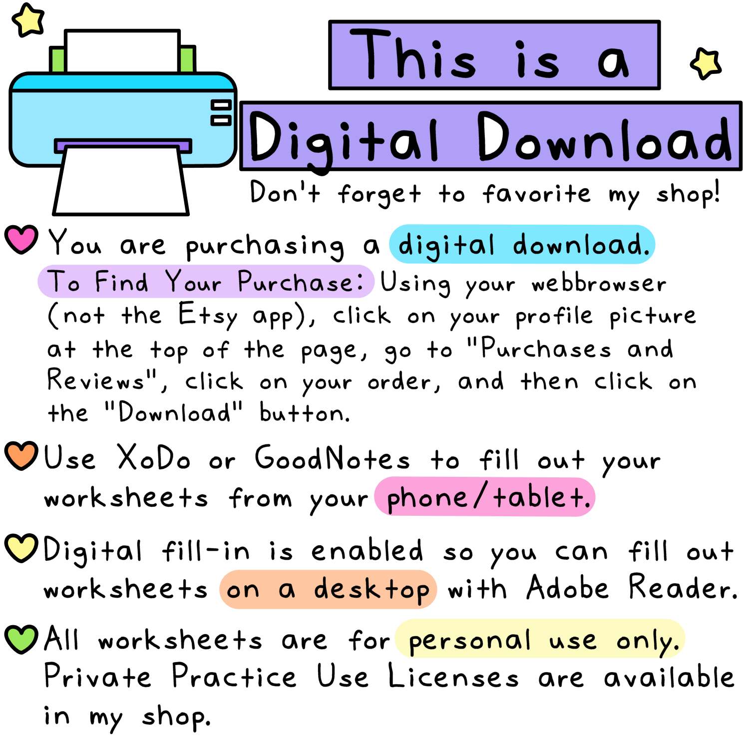 While I LOVE talking about mental health - I am NOT a professional. All of my worksheets come from lived experience which makes them unique but it's also important to note that they aren't a replacement for therapy. I'm not a therapist and I always recommend you work through my workbooks with one!