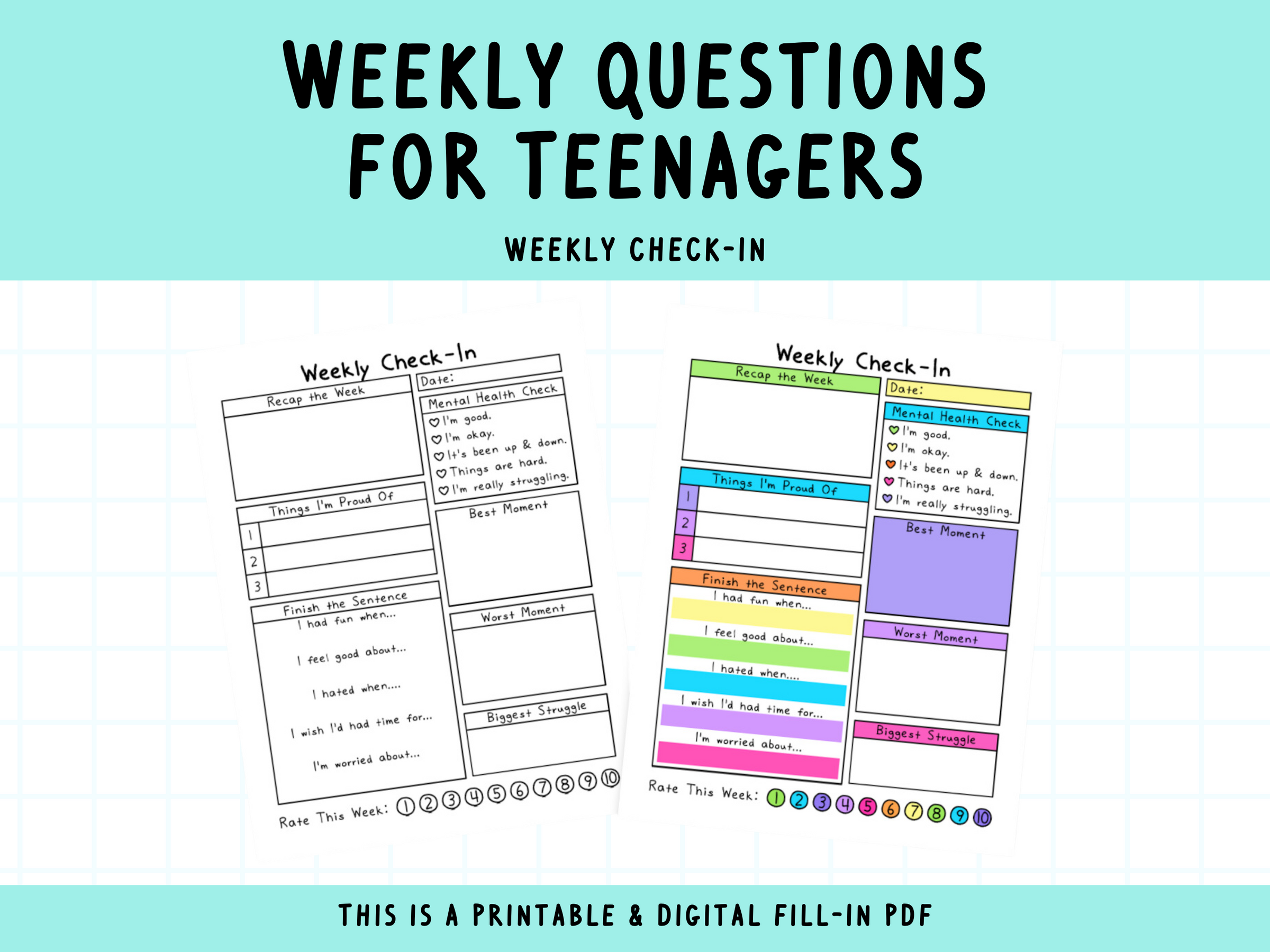You're getting ONE colorful weekly check-in page for teens (along with a black and white version for easy printing!