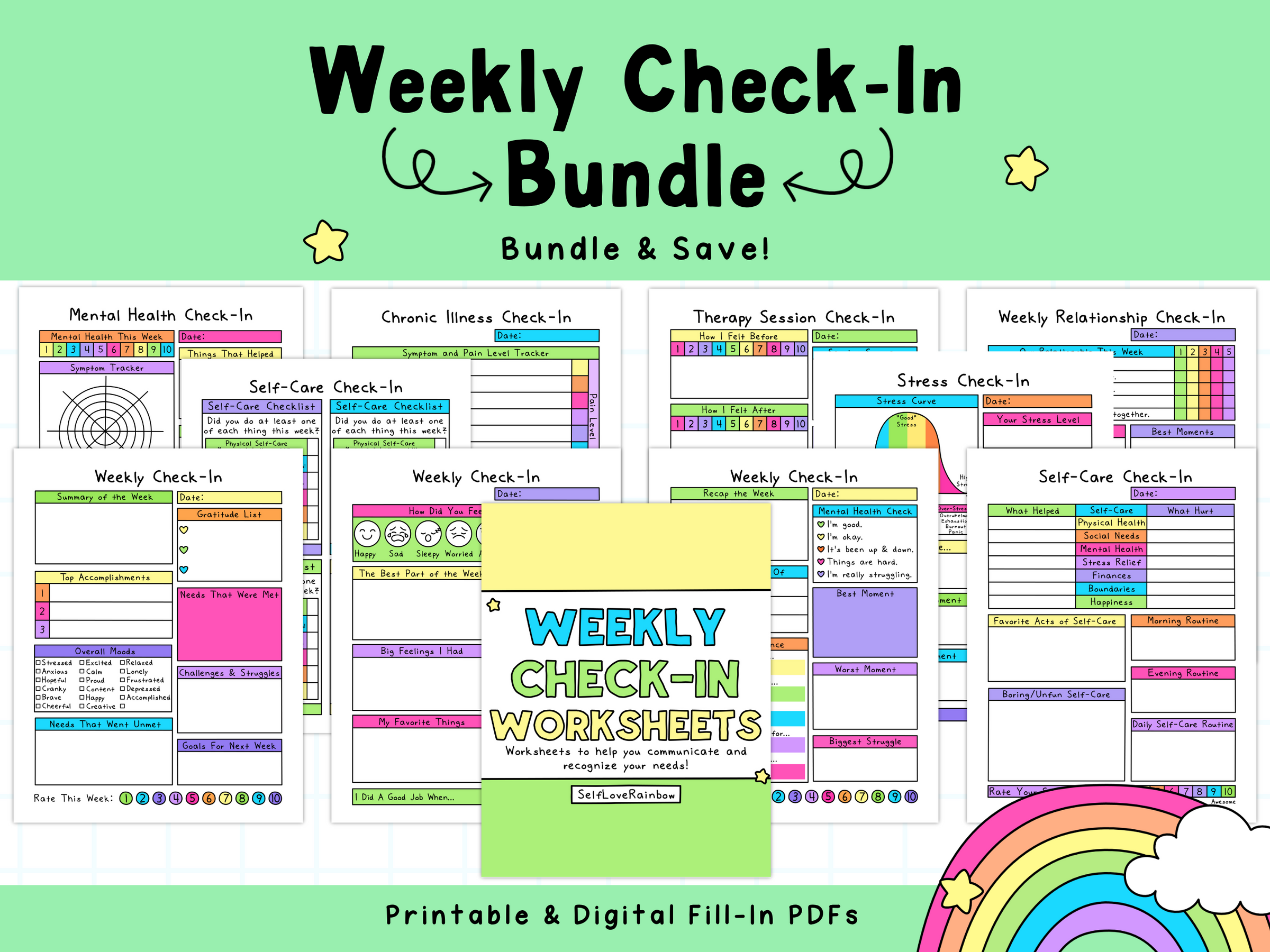 We can't fix/change/improve things when we're not acknowledging there's an issue and I've found that we get so caught up in our everyday lives that it's hard to see the issues until they cause harm in our lives. These weekly check-in worksheets can help us see where we might be neglecting aspects of ourselves and our lives. They can also help us see patterns and what's contributing in a positive or negative way! You can also take a look at my Instagram where I frequently share similar prompts!