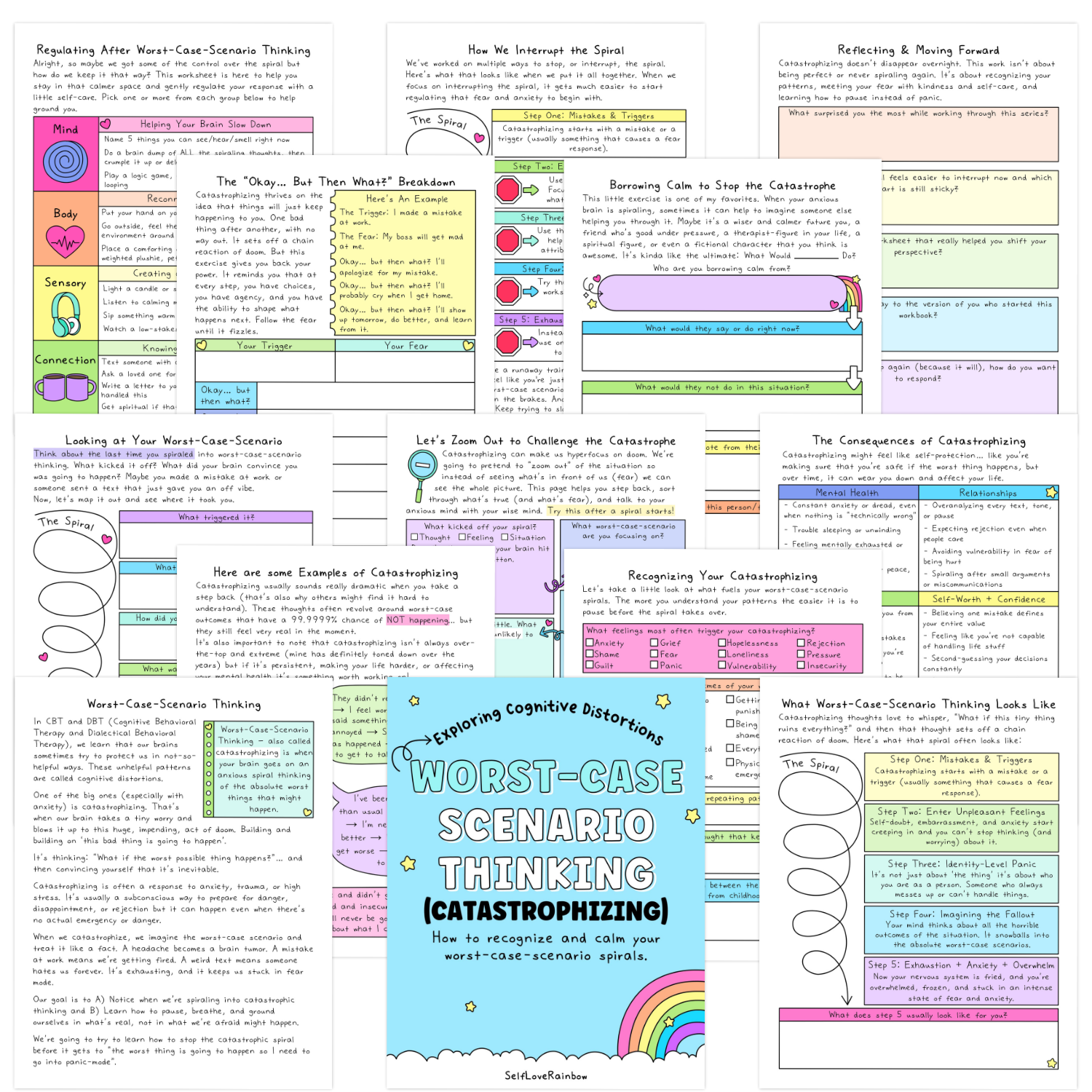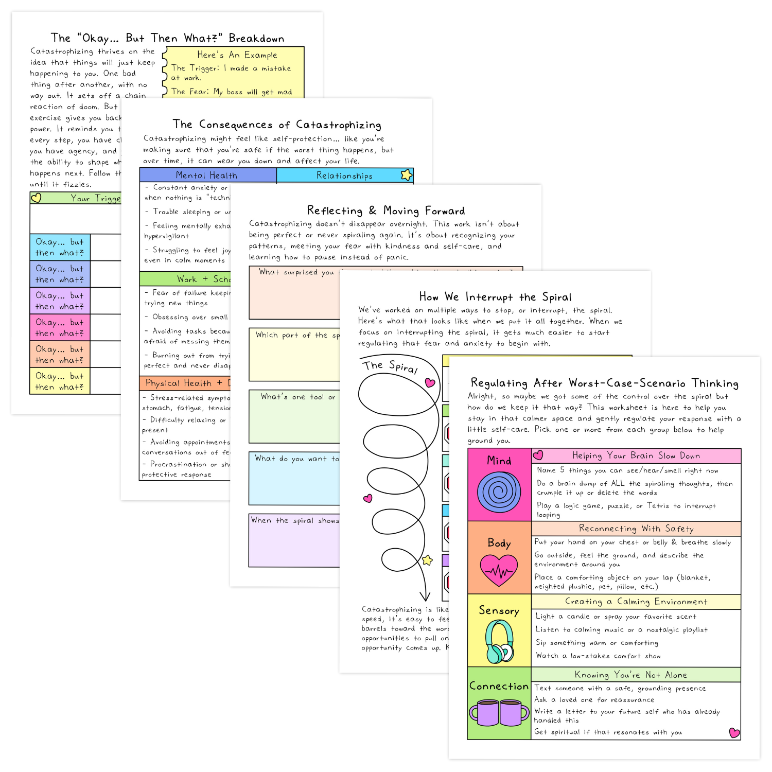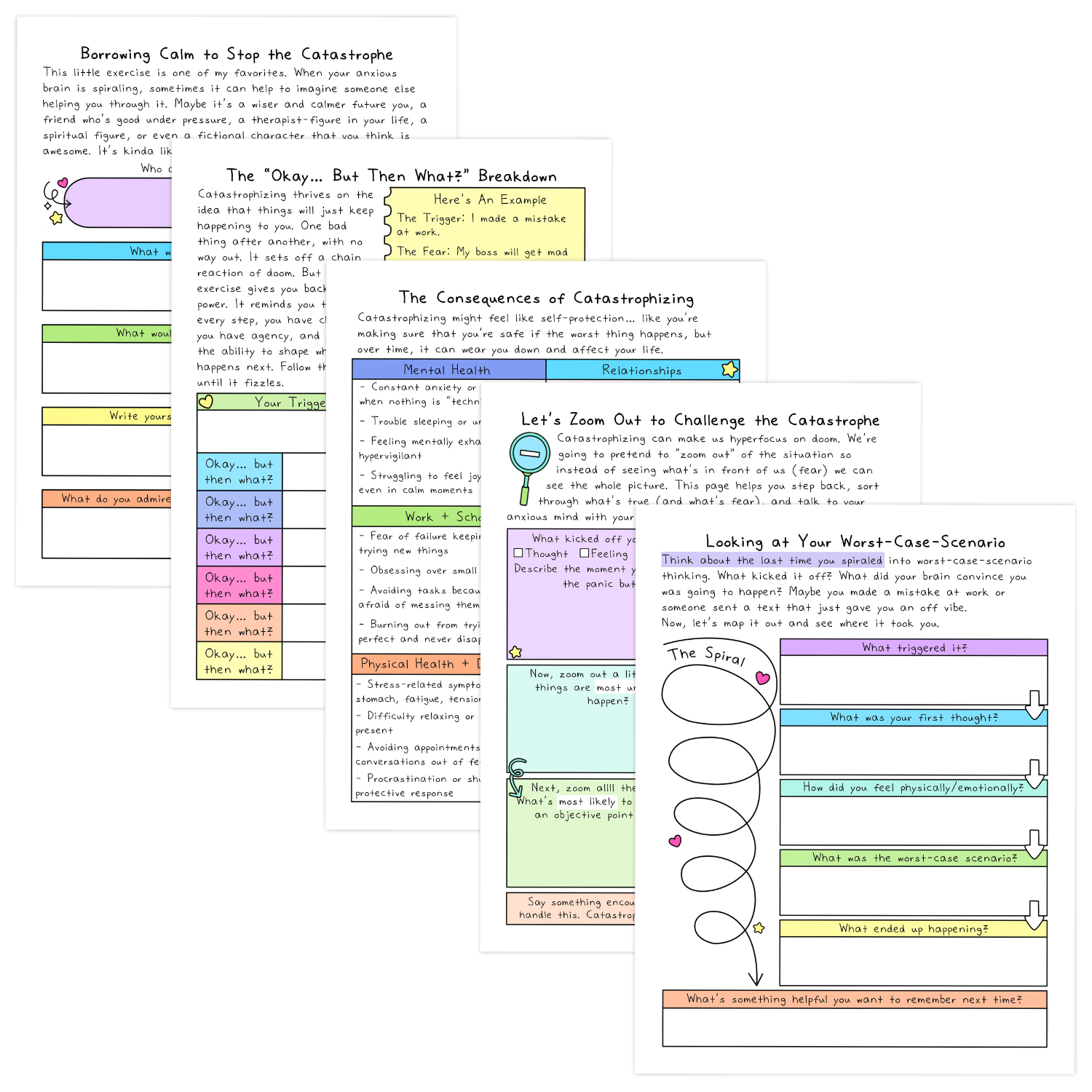 - Recognize Your Personal Spirals: Explore worksheets designed to help you identify your unique triggers, common themes, and emotional patterns that fuel your catastrophic thoughts. You'll also learn the five common steps of a catastrophic spiral, from the initial trigger to the final feeling of overwhelm.