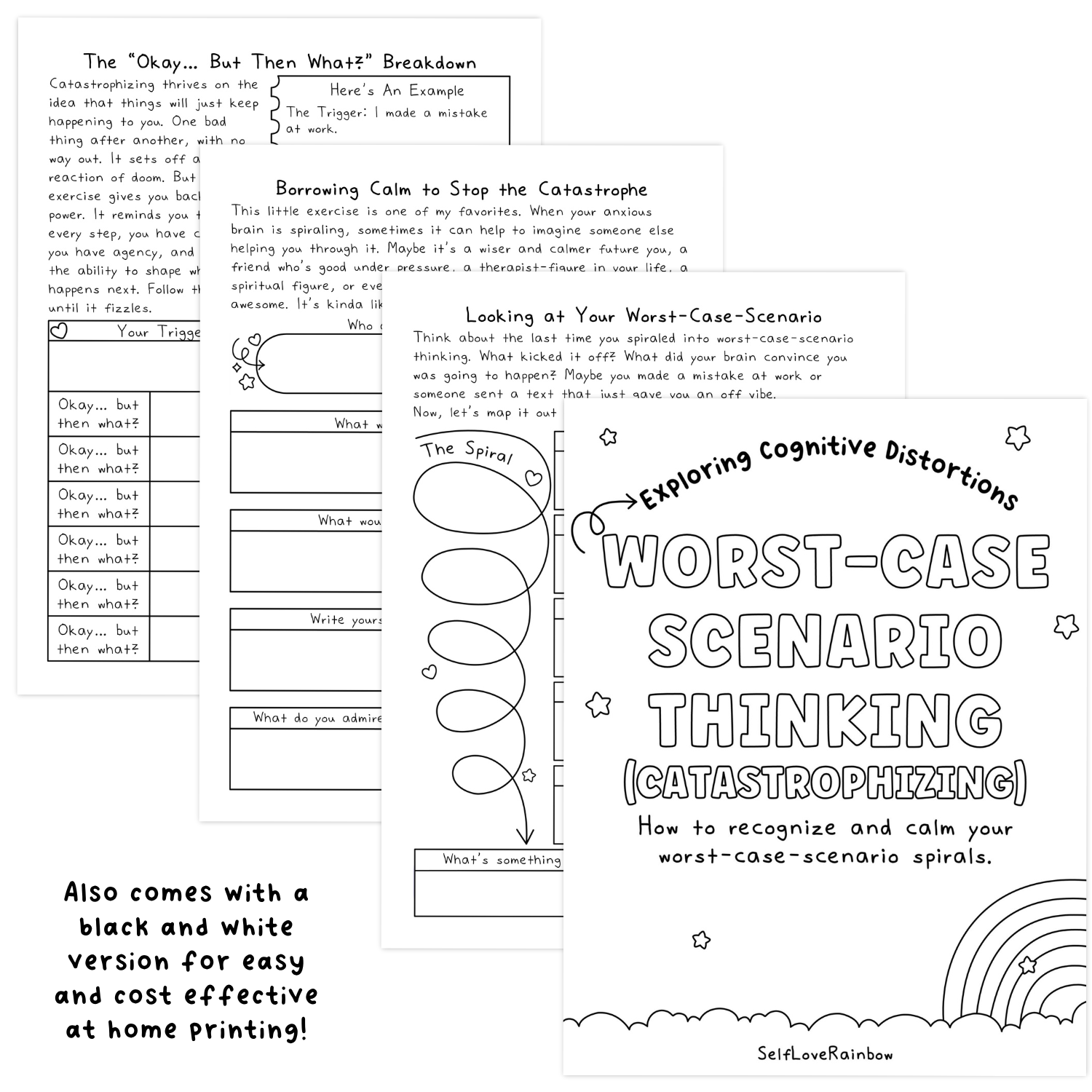 Ever find your mind racing, convinced that a tiny worry is about to explode into a full-blown catastrophe? That's called "worst-case-scenario thinking" (also known as catastrophizing). It's a cognitive distortion that many of us experience, especially when there is a history of anxiety, stress, trauma. This workbook is designed to help you understand and navigate catastrophizing while giving you tools to help stop the spiral.